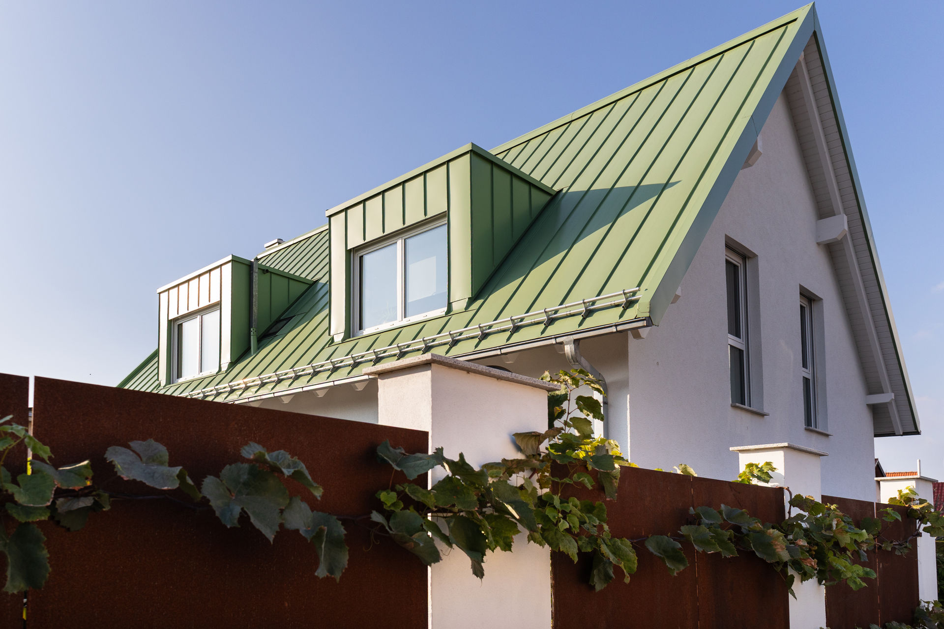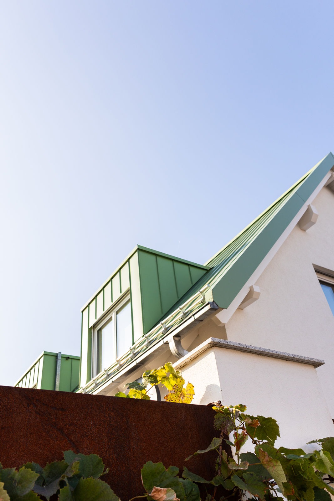 Fassadengestaltung im Leipziger Land! Mitten in der alten Bergbausiedlung in Zwenkau entstand im Sommer 2021 der Neubau eines Einfamilienhauses, der sich optisch wie selbstverständlich in die umgebende Bestandsbebauung einfügt. Neben der Innenarchitektur waren wir hier auch für die Fassadengestaltung verantwortlich. Die Kubatur des Hauses orientiert sich am Charakter der benachbarten Siedlungshäuser, die Putzfarben und die Farb- und Materialwahl des Daches verweisen auf die aktuelle Entstehungszeit. Die farbige Stehfalzdeckung aus Aluminium verleiht dem Wohnhaus seinen individuellen Charakter.