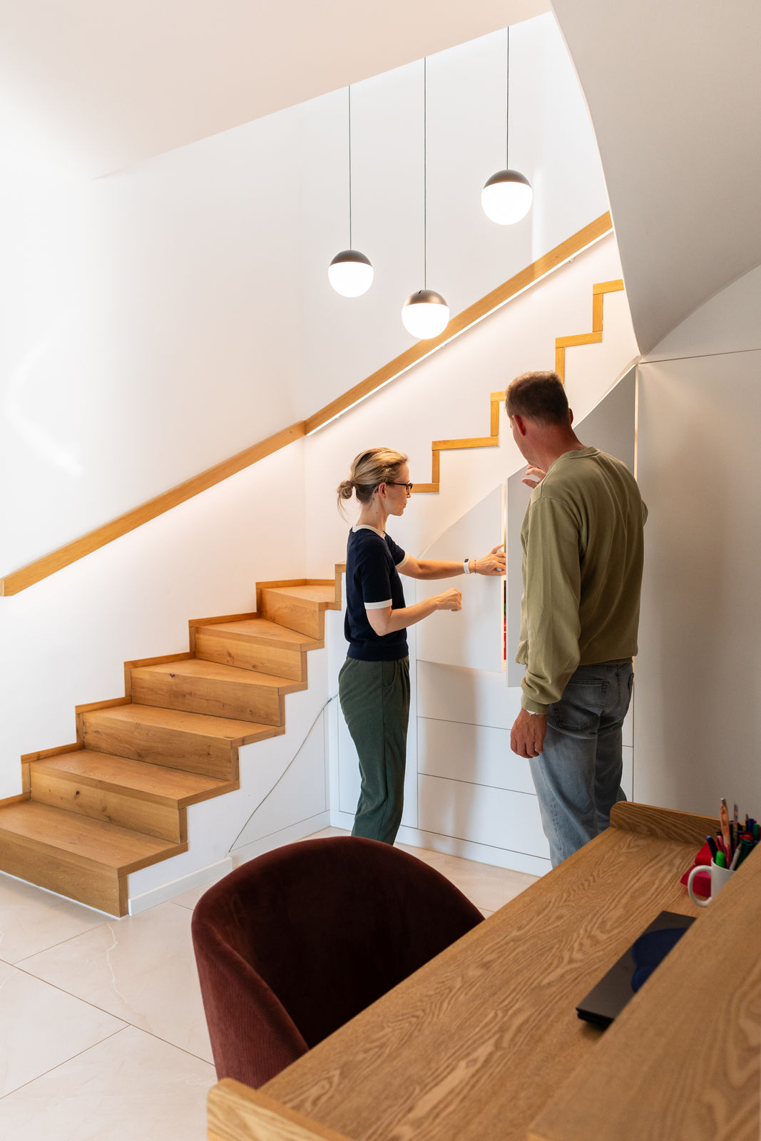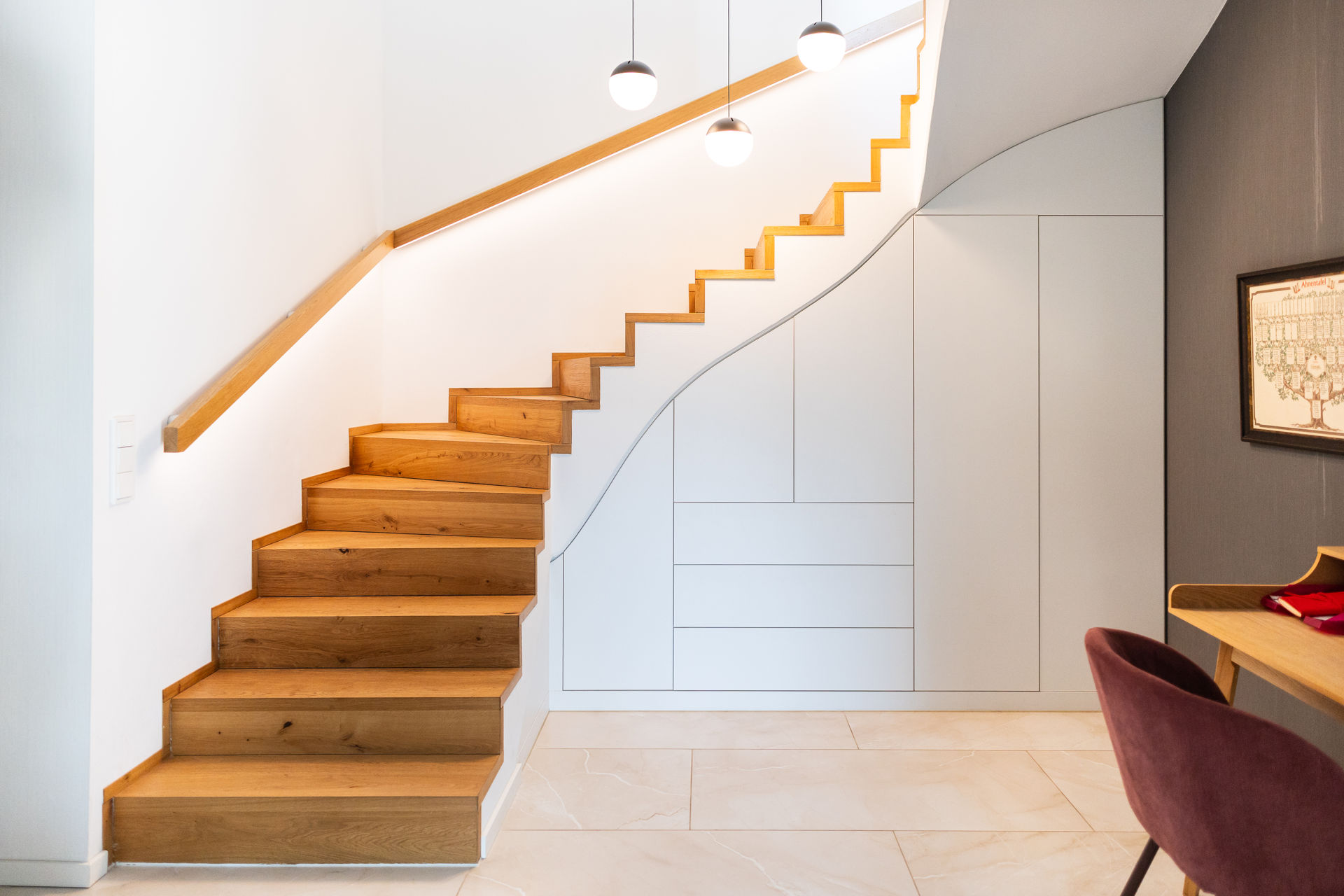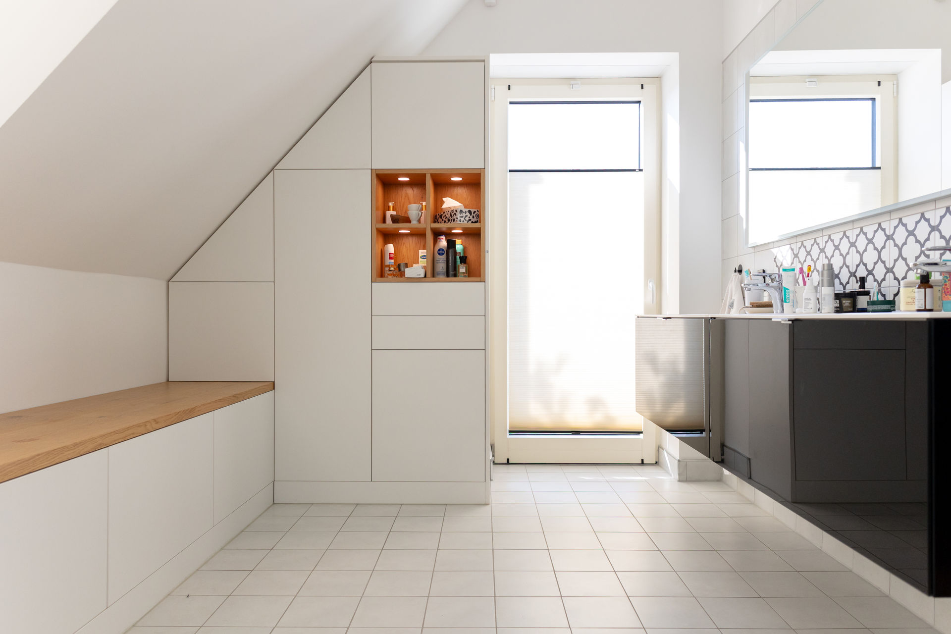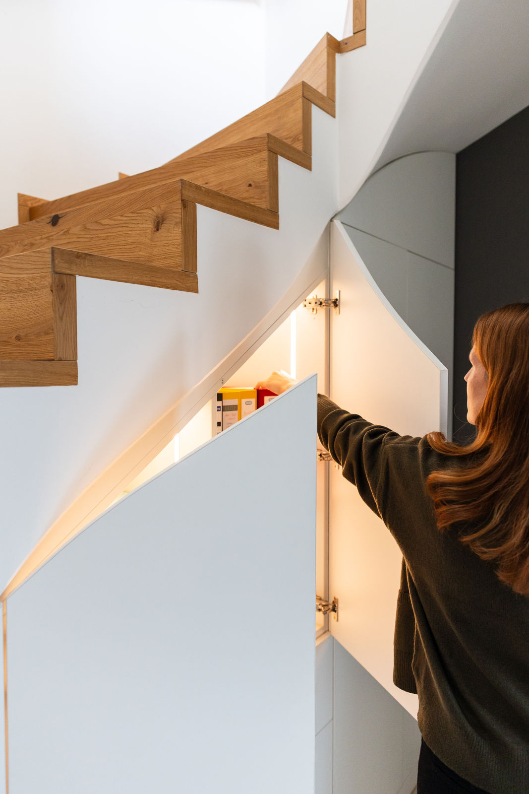 Ein besonderes Vergnügen war die Entwicklung von Einbaumöbeln zusammen mit unserem Tischler – sowohl im „Kinderbad“ als auch im Flur. Der beleuchtete Flurschrank unter der Treppe – mit Schablonen millimetergenau angefertigt – bietet ungeahnten Stauraum und bildet das Herzstück des Hauses.
