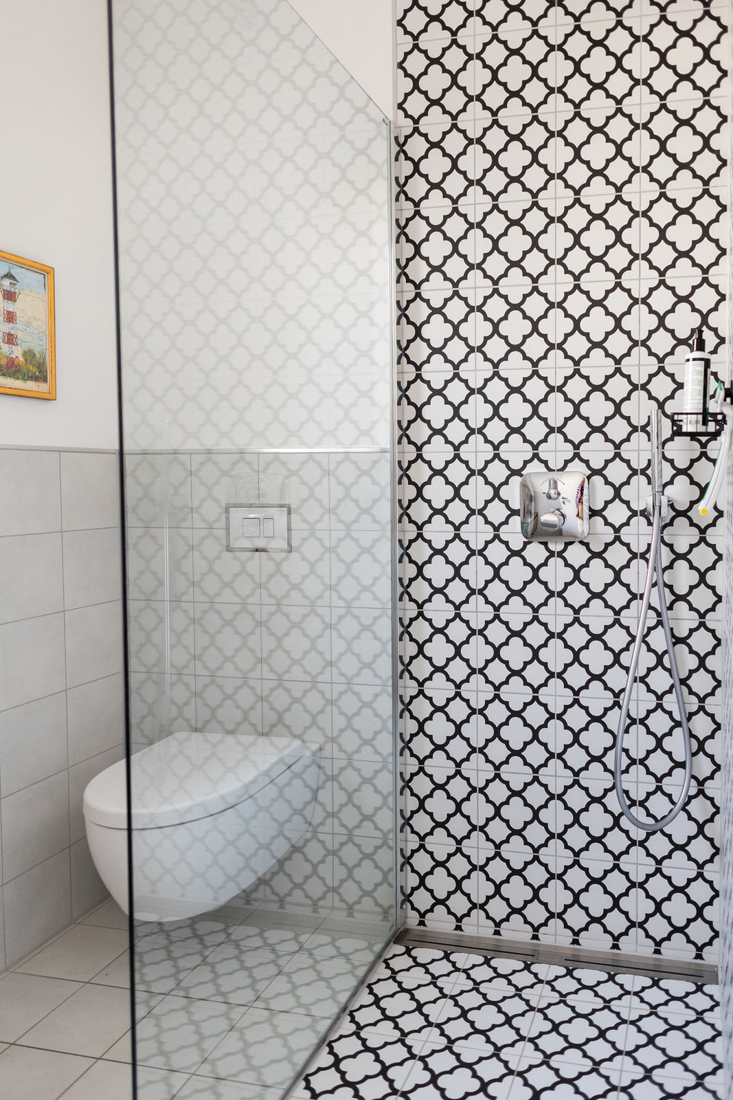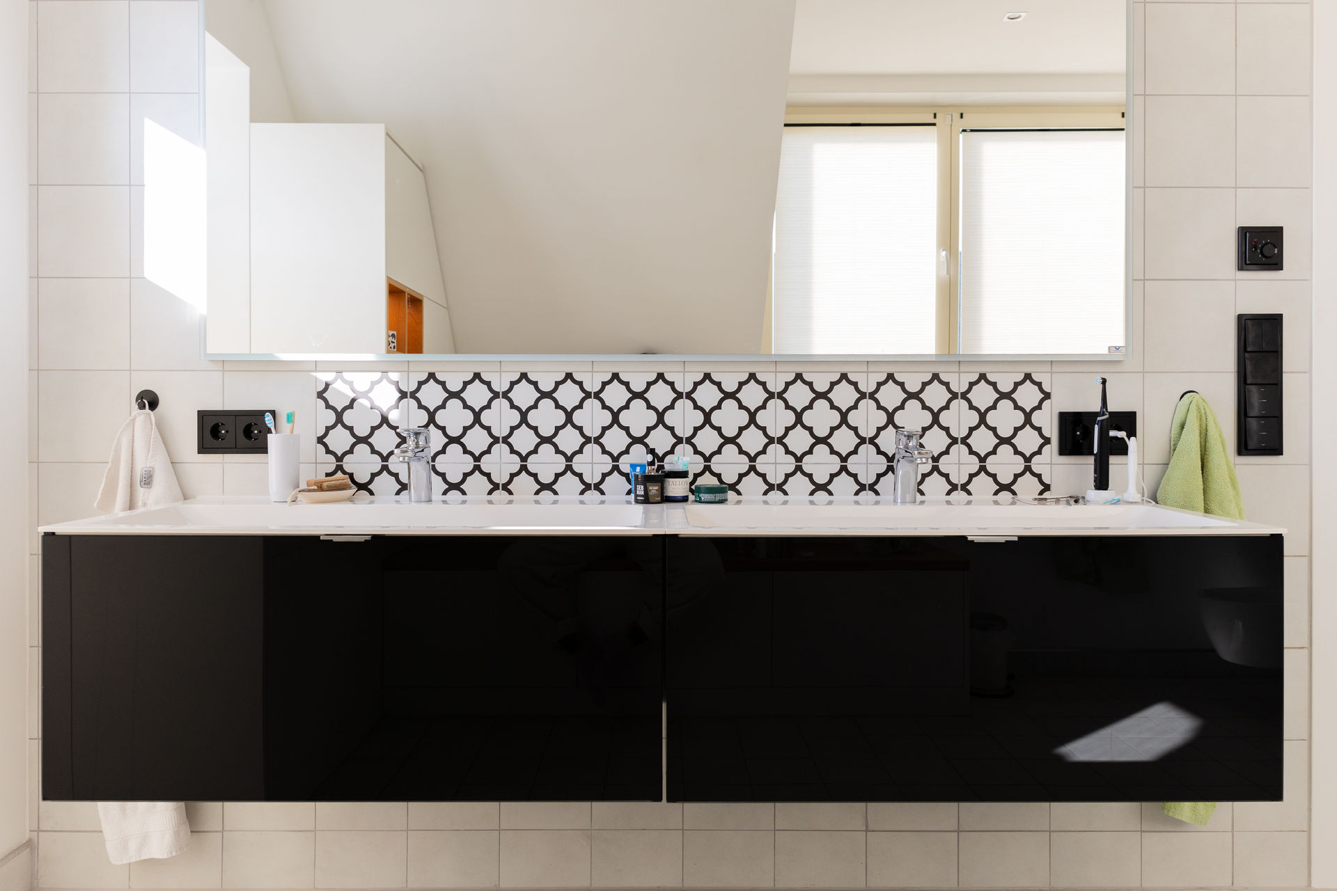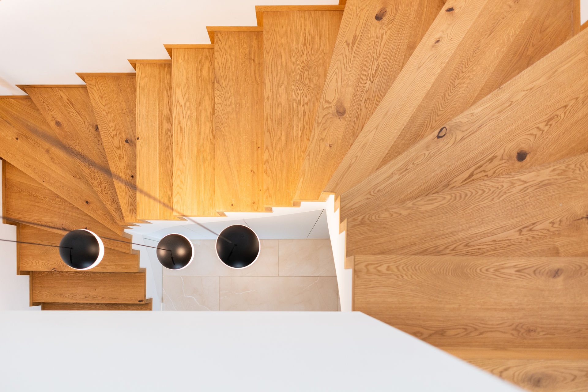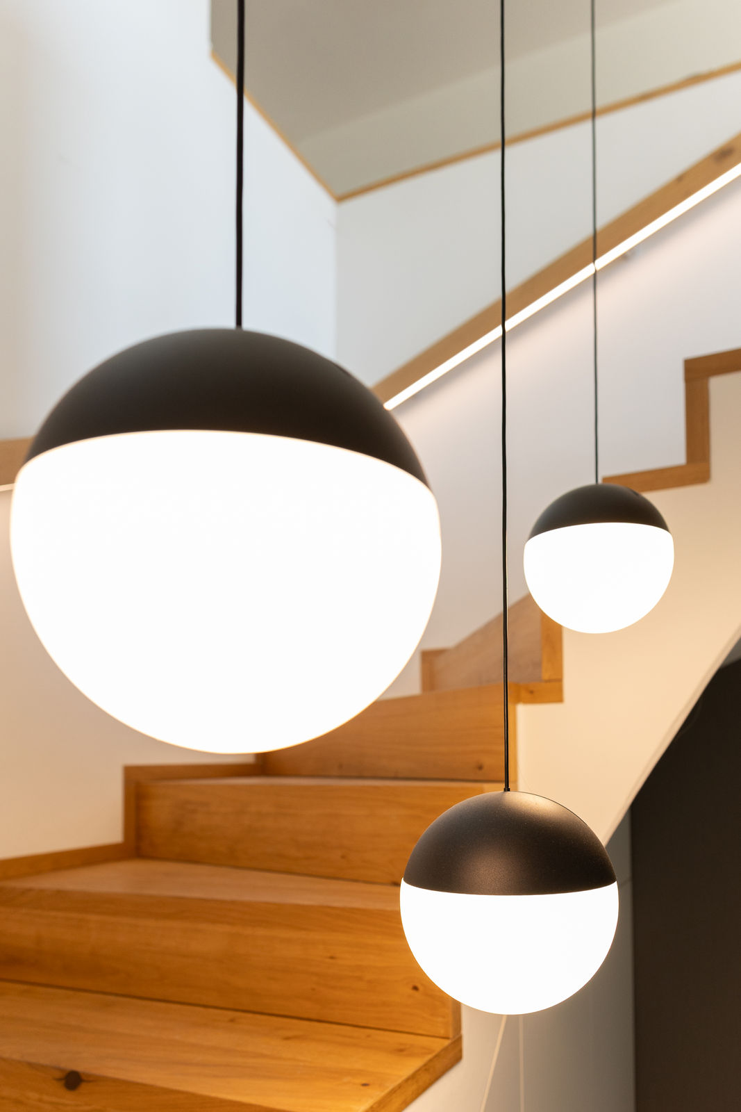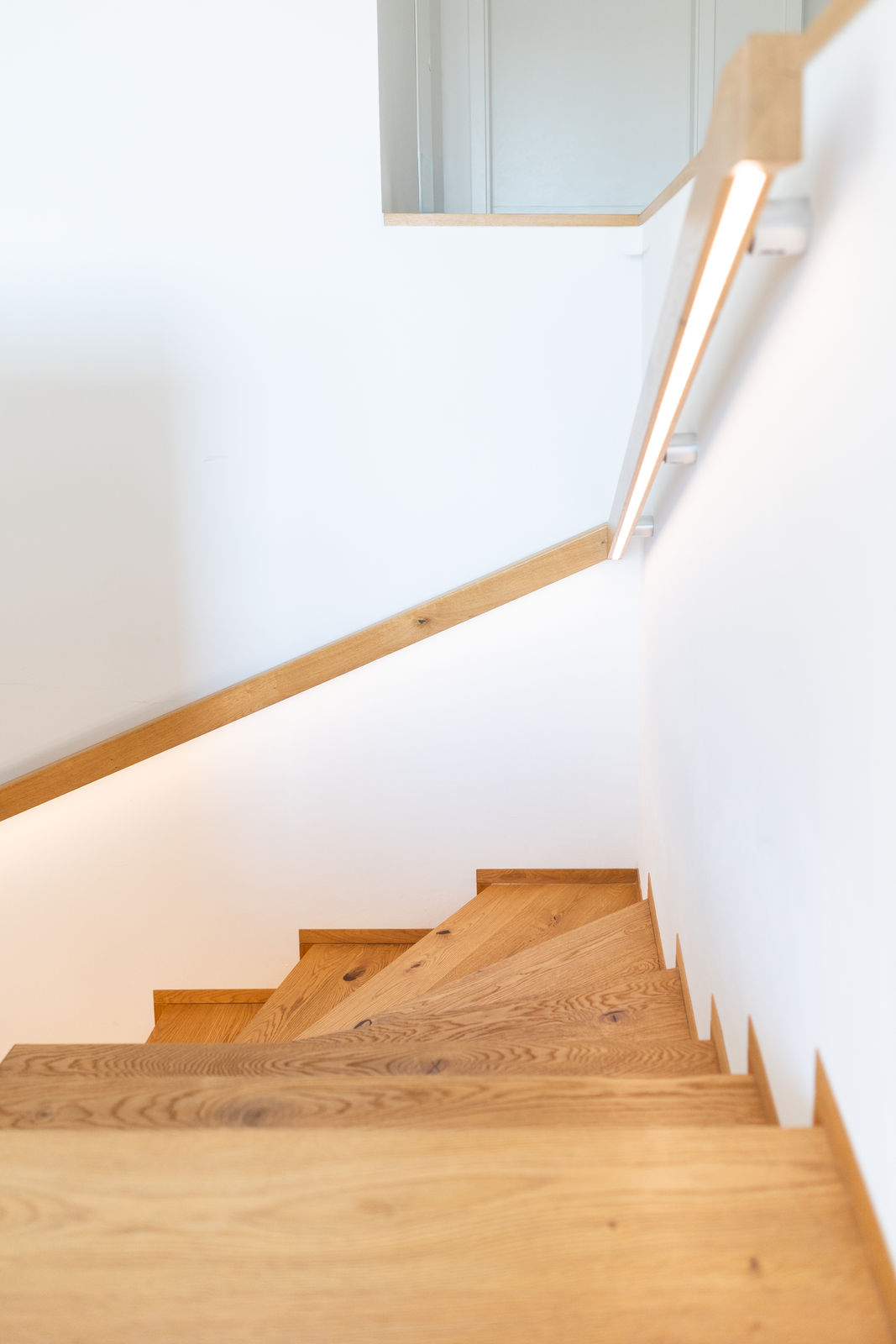 Ein besonderes Vergnügen war die Entwicklung von Einbaumöbeln zusammen mit unserem Tischler – sowohl im „Kinderbad“ als auch im Flur. Der beleuchtete Flurschrank unter der Treppe – mit Schablonen millimetergenau angefertigt – bietet ungeahnten Stauraum und bildet das Herzstück des Hauses.